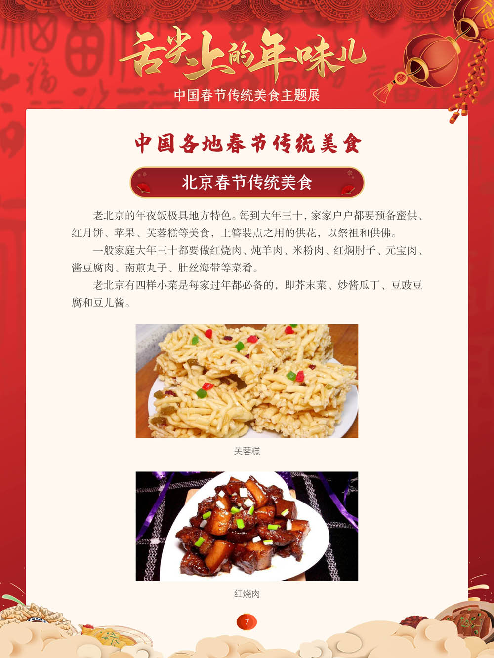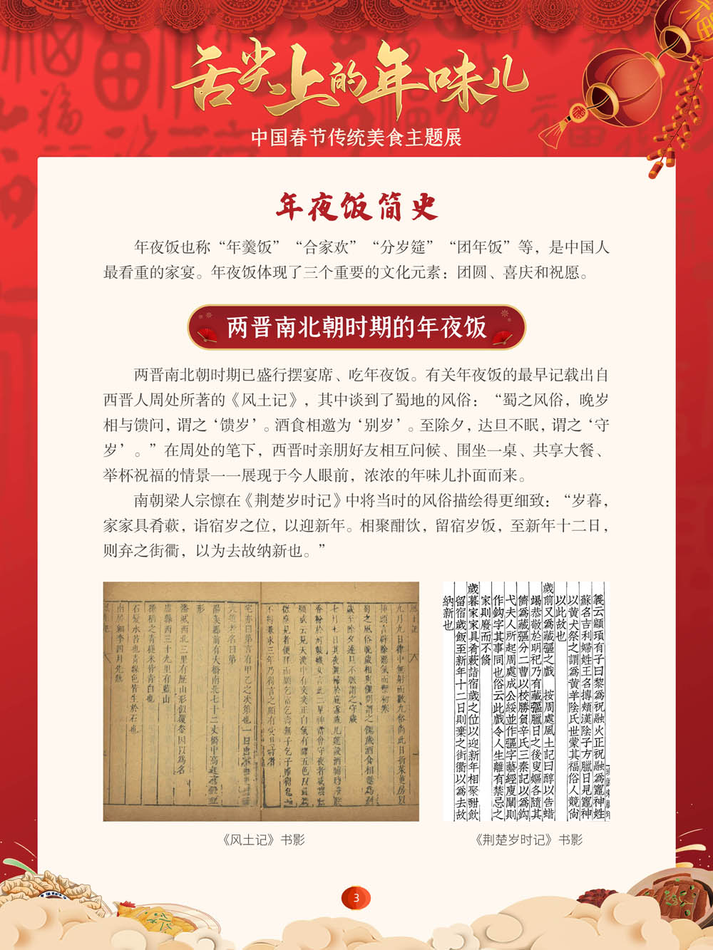 值此新春佳节来临之际,我们特别策划了“舌尖上的年味儿——中国春节传统美食主题展”,分“年夜饭简史”“中国各地春节传统美食”“中国各民族春节传统美食”三个部分,以图文并茂的形式展示我国各地、各民族的春节传统美食,彰显中华传统饮食文化的魅力,并引导大家通过本展览深入了解中国春节饮食文化,感受优秀传统文化的独特魅力。