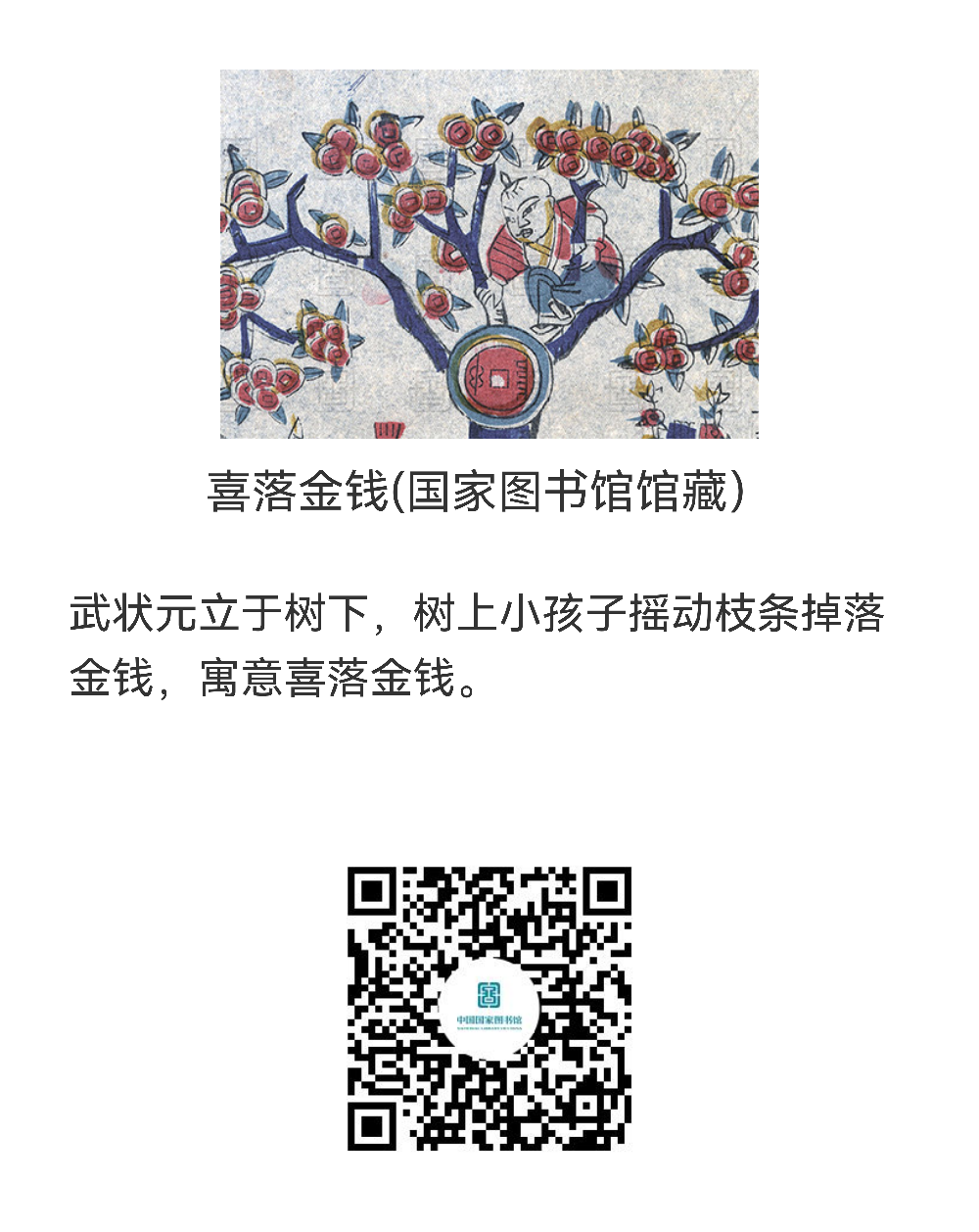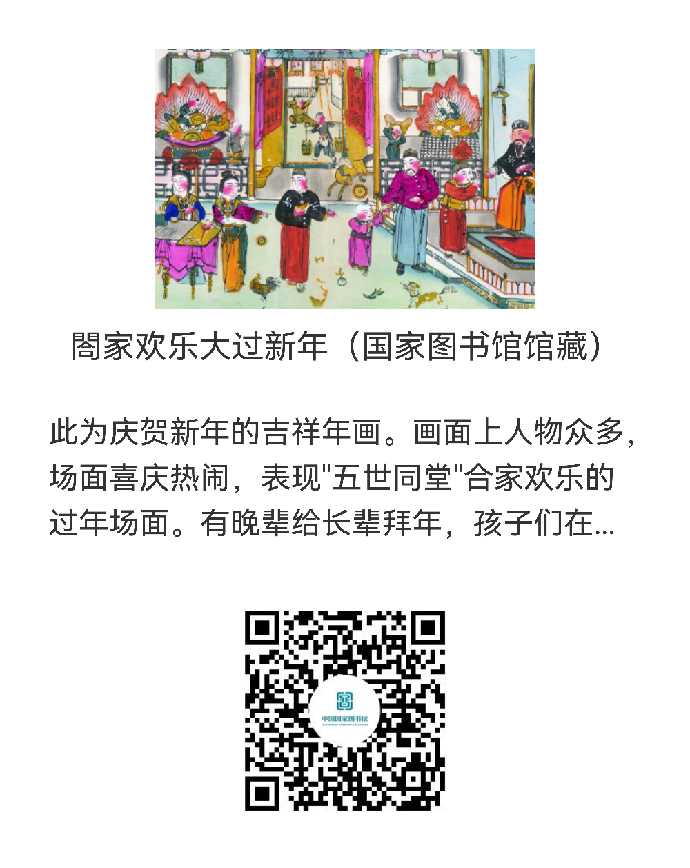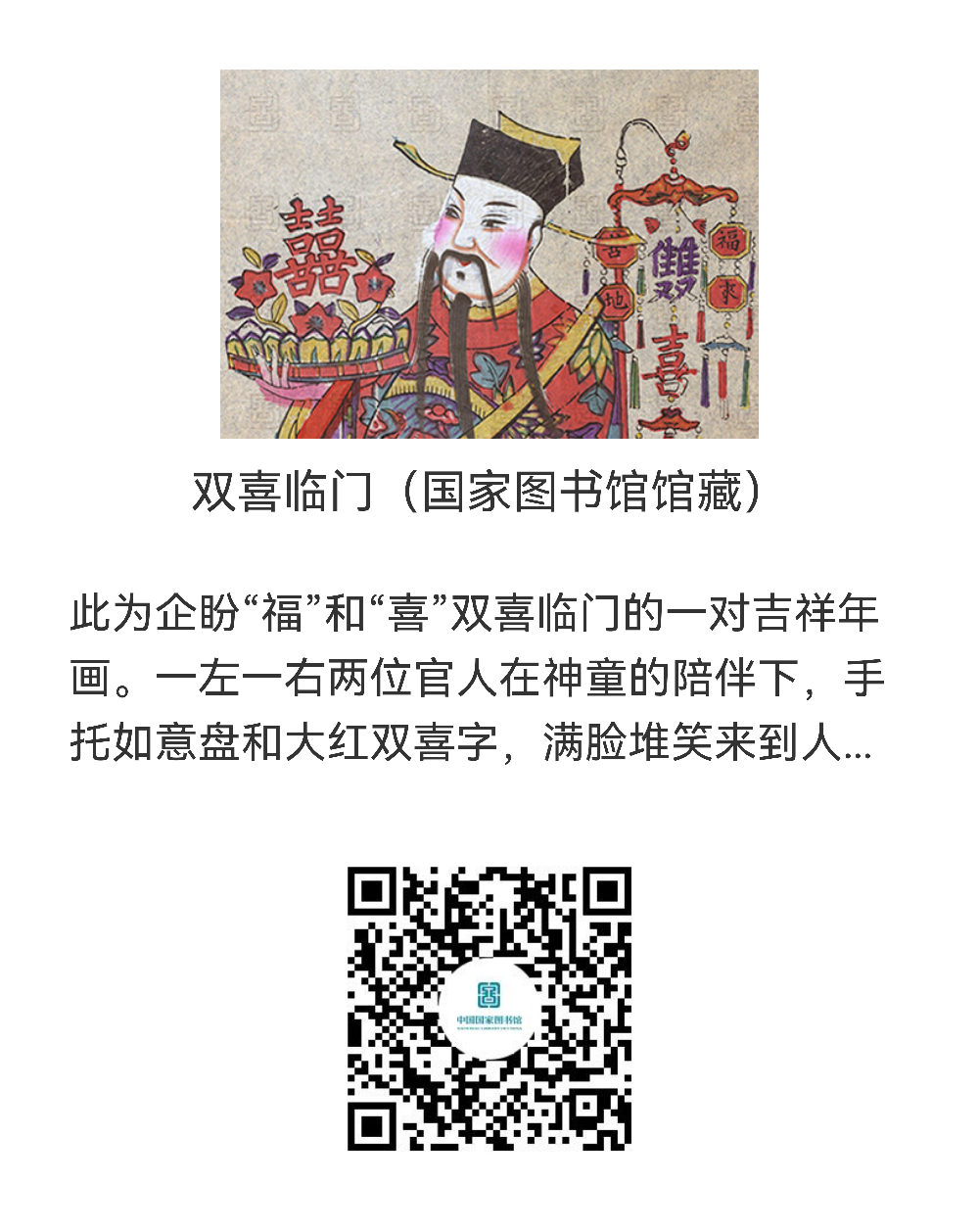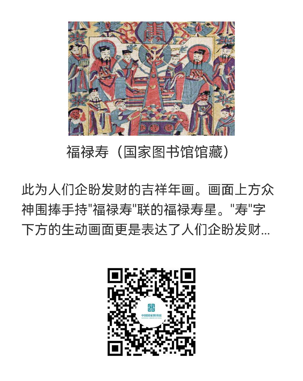 年画是中国的一种古老的汉族民间艺术,它反映了人民大众的风俗和信仰,寄托着人们对未来的希望。年画的起源可以追溯到人类远古时期的自然崇拜观念和神灵信仰观念,中国早期的年画都与驱凶避邪、祈福迎祥这两个主题有着密切关系,在祈祷丰收、祭祀祖宗、驱妖除怪等年节风俗习俗化的过程中,逐渐出现了与之相适应的年节装饰艺术。在中华民族最传统、最隆重、最美好的节日里,为大家精心挑选了六种年画资源供读者赏析,扫描下方二维码观赏即可。