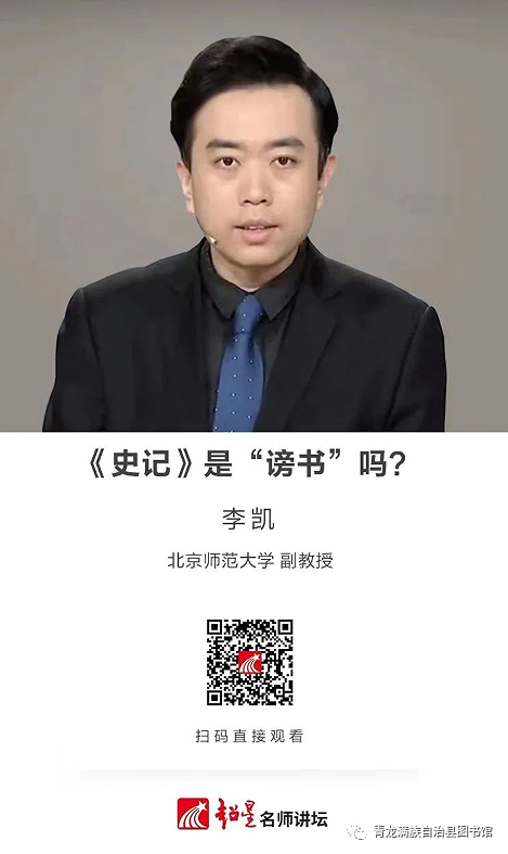 《史记》是傍书吗? 李凯 ▏北京师范大学 副教授▏ 青图讲座 | 第76 期 《史记》是司马迁用一生的精力、艰苦的劳动,并忍受了肉体上和精神上的巨大痛苦,拿整个生命写成的一部永远闪耀着光辉的伟大著作。其时,汉武帝广开献书之路,把收集到的经典集中到皇家图书馆,由史官掌握。因此,司马迁的写作不是纯个人行为,《史记》乃是国家史之首。 李凯,北京师范大学历史学院副教授、历史学博士。参与教育部统编高中教材的编写。曾获得北京师范大学青年教师基本功一等奖。央视《百家讲坛》《百家说故事》主讲人,著有《先秦巡狩研究》等。