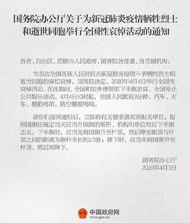 为表达全国各族人民对抗击新冠肺炎疫情斗争牺牲烈士和逝世同胞的深切哀悼,国务院今天发布公告,决定2020年4月4日举行全国性哀悼活动。在此期间,全国和驻外使领馆下半旗志哀,全国停止公共娱乐活动。4月4日10时起,全国人民默哀3分钟,汽车、火车、舰船鸣笛,防空警报鸣响。