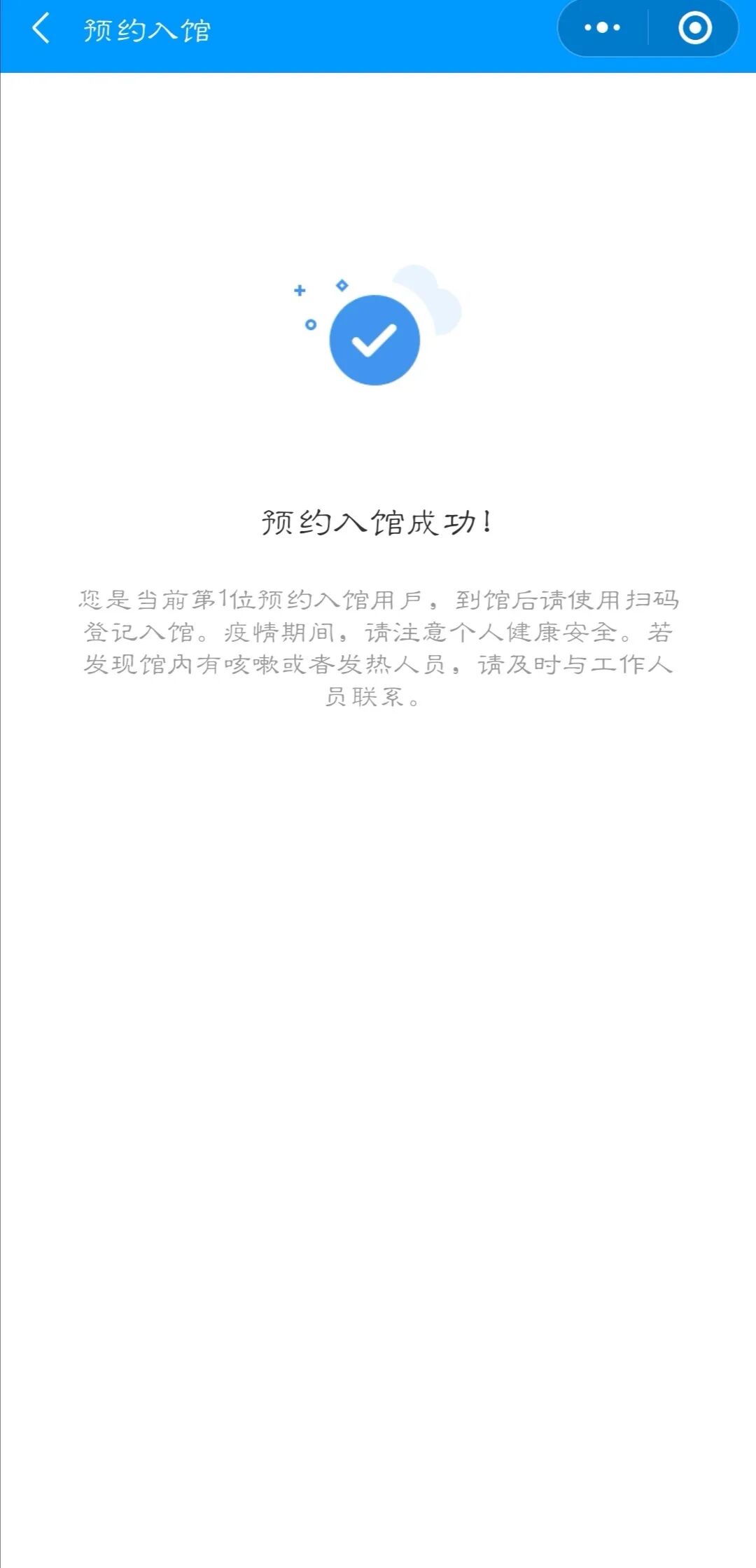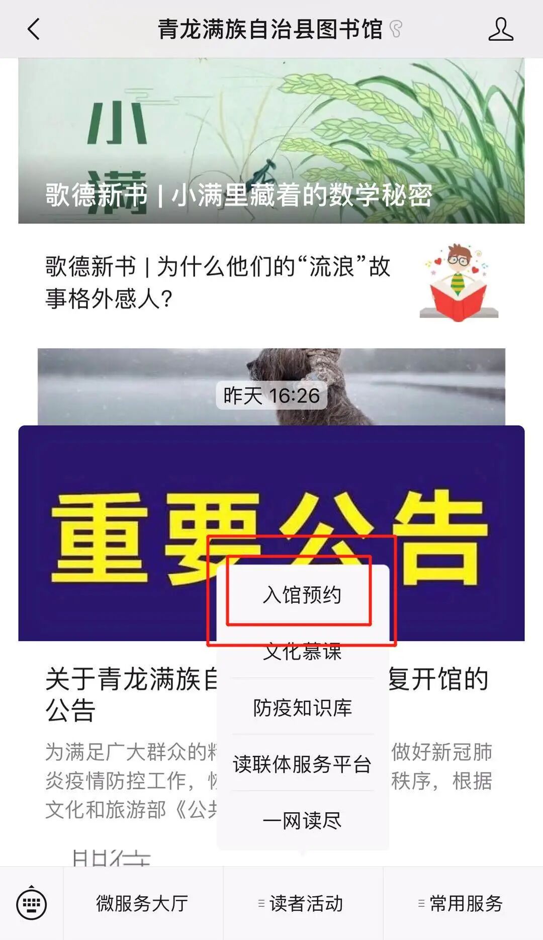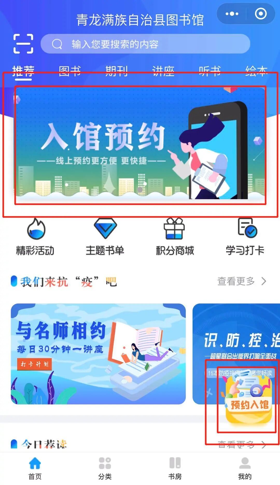 预约 阅读时光 READING TIME 青龙满族自治县图书馆“超星读书”小程序 入馆预约 小程序的便捷、轻量,让爱阅读的人能快速聚焦精准推荐的内容,而优质的书单和兴趣拓展内容也将引导读者一步一步完善知识体系,有选择地进入移动图书馆APP进行深度阅读和学习后,将会通过数据分析见证完整的阅读路径和成长轨迹。小程序和APP的绝佳组合,将让每位读者完美享受自我精进的高品质阅读生活。 为方便广大读者,超星读书小程序推出入馆预约功能,简单三步,即可预约专属阅读时光。 约——入馆预约 1、关注青龙满族自治县图书馆微信公众号,点击读者活动进入入馆预约。 2、进入小程序,点击红框中预约入馆 3、点击进入,填写基本信息,在规定的开馆时间内,填写预约时间 4、进馆后,扫码验证,即可入馆 5、出馆时再次进入预约入馆页面,点击出馆即可 • end •